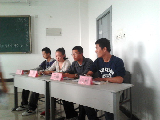首场辩论赛由安全11-3班的刘�担任主席,参辩双方为安全11-4班与消防11-1班。董威,李翰林,何选泽等七位10级辩手担任本场比赛的评委。本场辩论赛以“爱一行干一行”还是“干一行爱一行”为主题展开了激烈辩论。