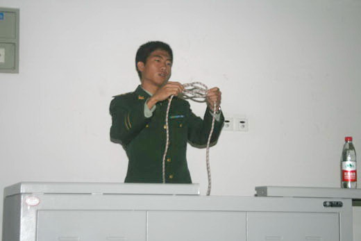 青协邀请到的消防战士在热烈的掌声中走进教室,讲座正式开始。讲座的开始,消防战士以俄罗斯和莫斯科友谊大学的宿舍火灾事故为例,给同学们敲响了警钟。随后消防战士又讲述了白天鹅酒店火灾,借此说明国人防火意识的严重缺乏。紧接着,消防战士又介绍了宿舍、教室、礼堂、车站、商场等地的火灾防范和消防须知。在讲座中,消防战士们还现场演示了火灾逃生时双平结和结结的两种打绳结方法,并邀请了一名青年志愿者以及其他两名新生上台表演,亲自授予他们打绳结的方法。