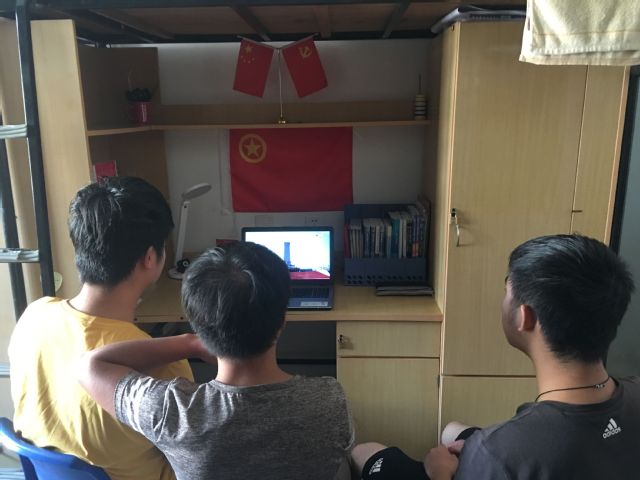 团委、学生会组织学生在学生寝室和党团活动室收看阅兵式。