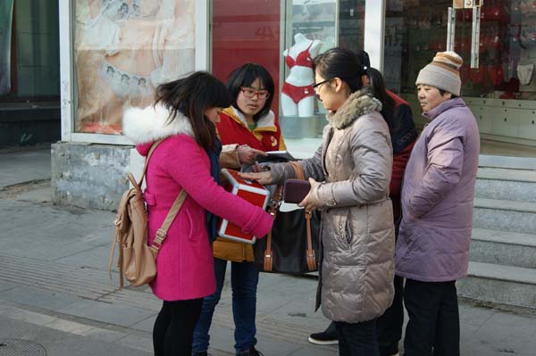 早上8:00,同学们在梅一楼下准时集合,在班长崔捷的带领下前往北门。随后乘坐公交到达古彭大厦。9:00,在领完报纸和募捐箱,并自由组合后义卖活动正式开始。同学们两个或三个一组奔走在十字路口、公交站台、商店门口等人流量大的地方,向来往的行人详细地介绍王帅一家的的情况,说服人们献出一份爱心。即使遭受到拒绝和非议,同学们仍然没有放弃每一次尝试,因为他们的每一次努力都是为了给这个家庭带去一点点希望和力量。房龄航和彭雨佳同学更是运用自己大学生的优势顺利的用英语向一位俄罗斯人说明了情况,因此他也为王帅一家献出了自己一份爱心。与此同时另一边崔捷和马振凯等同学凭借不懈努力募集了四百多元善款。12月的徐州很冷,同学们的手冻得通红,但是他们没有抱怨,并坚持义卖到中午12:00。一上午的辛苦没有白费,同学们一共卖出了420份报纸,募集善款总共3122.8元。义卖结束以后,班长崔捷带领同学来到徐州附院看望王帅及其父亲,并亲自将善款交到了王帅母亲手里,为他们带去了一份极大的鼓励和温暖。