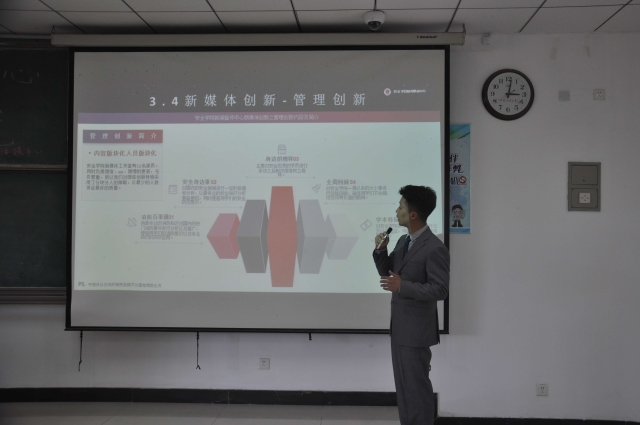 基于前四项基本工作开展的创新特色工作。在这个版块,他首先展示了安全新宣制作的特色期刊《安报》、《团学工作简报》,同时说明了由安全新宣主办的多项特色活动的具体情况。人物专访创新则是分为了“身边的榜样”和“风云人物”两块,分别采访身边优秀的同学和优秀的毕业生。在新媒体管理创新上,贺涛着重讲解了新媒体在技术领域上的创新:从有声电台,视频中心发展到多变H5平台。在结语的工作寄语—责任、耐心、毅力、拔尖八字以后,答辩会的陈述部分到此结束。在随后的提问环节中,胥振以简洁的语言,高度精炼的概括回答了评委老师提出的有关有声电台内容等问题,获得了评委老师以及同学的一致肯定。