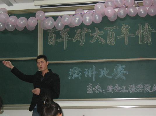 团委主办、科技实践部承办的演讲比赛在教二A303举行。此次演讲比赛主题的为“百年矿大百年情”。