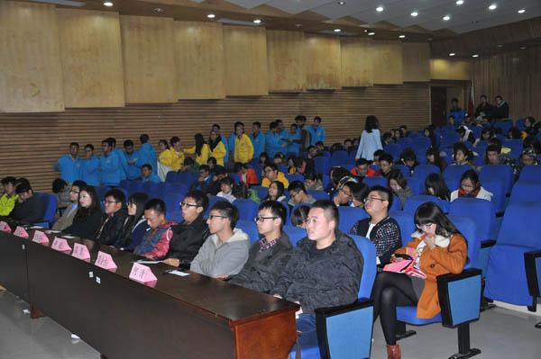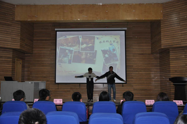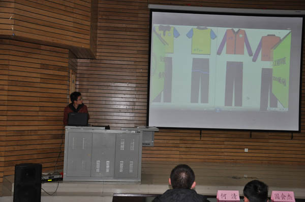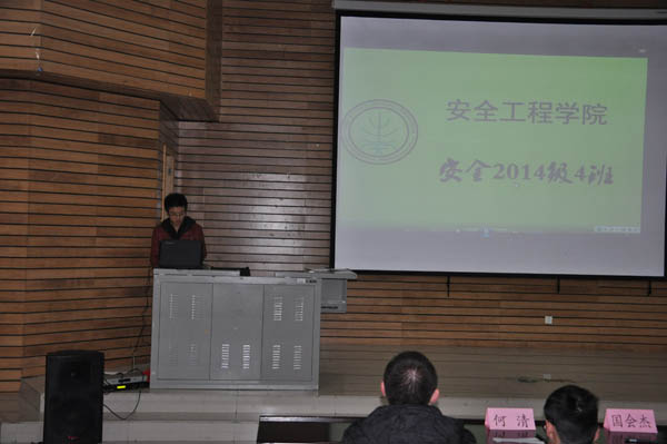 19时许,比赛正式开始,各学院按既定出场顺序依次上台展示,每班进行4分钟内的作品设计及班级特色讲解和班级才艺展示。刘震坤代表安全14-5班进行作品设计的讲解,班徽采用深蓝色调,形若盾牌,中央一个展翅雄鹰背负金字塔迎面飞来,体现了5班追求梦想的精神;班旗由红、黄、蓝、绿、紫组合而成简洁大方;班服为浅蓝色,胸前佩有班级班徽。接着,刘震坤和许佳佳的才艺展示《小苹果》更是激情无限,体现了青春少年的无限活力。辛正浩代表安全14-4班进行作品的讲解,其班徽以“安”为底,呈扁长状,安字一点上长出一颗参天大树,突出了发扬安全的理念和追求学术的决心。各班展示精彩纷呈,有凤与凰的结合,有开天辟地的巨斧,有首尾相接、循环往复的三角形,思维在此处碰撞,理念在这里相接。