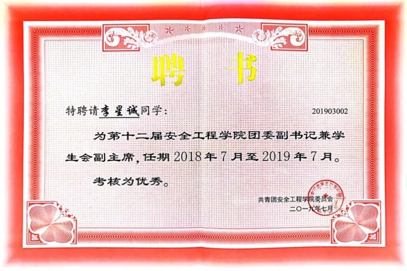 主要学生干部经历:第12届院团委副书记