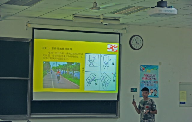 下午3点,培训准时开始,首先,教官向参加本次定向越野的同学们讲解了定向越野的意思,定向越野作为一项国防体育项目,要求参赛者要依靠一张详细的地图和一个指北针,按顺序到达地图上所指示的各个点标,以最短时间到达所有点标者为胜。接下来,教官就越野过程中的识图问题进行了讲解,作为定向越野的第一项任务,识图的重要性不言而喻,其中涉及到对越野图中地物地貌的识别以及对越野图中标号的理解。随后,教官又就定向越野中打点的问题进行了介绍,介绍期间教官亲自示范,并挑选一部分同学上前演示,同学们认真听讲,对此表现出很大的兴趣。培训最后,所有定向越野队员正式打点训练,每一位队员都在本次训练中取得了显著的进步。