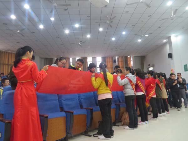 孟老师的讲话精简而富有哲理,讲话结束后,大家欣赏了精彩的手语表演《感恩的心》。继而由标兵分队力建学院学生代表宣读倡议书,希望我们能够感恩于心,感恩于行。活动由此进入开幕式的高潮,“感恩文化节”签字仪式正式开始,在礼仪的引导下,各学院的服务分队队长在条幅上签字。分队队长杜长州代表包子漫画