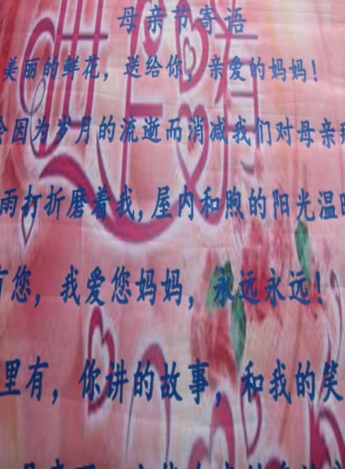 “有一种爱,一生一世不求回报――母爱?;有一个人,一生一世值得你爱――母亲。妈妈,今天是母亲节我想对你说:妈妈我爱您”,“世上有一种爱,任你肆意去索取却从不需报答,这种爱叫母爱,这个人叫母亲;多少年风风雨雨心酸苦辣您曾经经过,多少年默默承受无闻付出您从不问收获”……一张张卡片寄托着大家对母亲真诚的祝福,一张张卡片传递着大家对母亲永远的关心,我们将自己精心设计的卡片赠送到同学手中,引导大家共同来关心我们伟大的母亲,此次活动取得了圆满的成功。