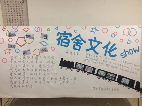 他们用铅笔勾勒图样,在灰白相间中绽放艺术的火花,用多彩的颜料涂抹出“宿舍文化show”的主题。板报中,他们画出奔驰向前火车,象征着永不停息的创新精神。之后,他们将宿舍文化节过程中拍摄的特色照片贴于板报上,让板报更加贴近同学们的生活。最后在板报空白处书写上宿舍文化节的相关材料,为制作板报画上了完美的句号。