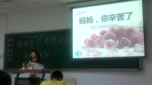 班会在大家欢快的笑声中进入关键环节:分享母亲的爱。一曲《妈妈,您辛苦了》贯穿整个流程,为班会渲染了浓重的母爱情怀。接着大家踊跃登上讲台分享母亲那留在自己心中最感动的刹那。温柔贤淑的母亲让人爱恋,坚强无私的母亲则更让人动容,听着他人母亲的经历,想着自己母亲的不凡,感怀母爱,有的同学甚至悄悄地流下了泪水。最后班会在感恩的气氛中接近尾声。