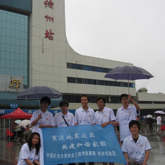 在出征仪式上,实践团队长带领各成员进行了出征前宣誓。虽然下起了雨,但依然不能减弱实践团成员们的热情。在雨中“重返地震灾区,共建和谐家园”实践团成员们激情飞扬,对此次活动充满了信心。实践团成员郑重接过印有“重返地震灾区,共建和谐家园”的大学生实践团的锦旗,这标志着他们跨出了奔赴灾区的第一步。
