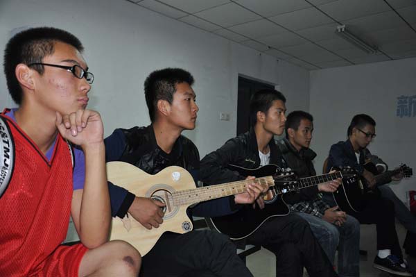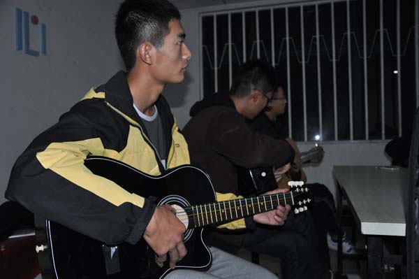 晚9点整,伴随着吉他组成员热烈的掌声,培训会正式拉开帷幕。首先赵伟伟讲述了吉他的起源及其发展历史,并且拿出自己的吉他耐心的向组员们讲解吉他的构造和发声原理。随后,赵伟伟鼓励组员们勇敢的进行尝试,通过弹奏一些简单的音符来熟悉各自的琴,并针对组员实践中犯下的错误进行了一系列的讲解和操作演示,场面十分热烈,组员们全神贯注的听讲解,做笔记的同时并积极提问。最后,赵伟伟对本次培训作了简短的总结,并殷切的鼓励组员们在今后的练习中可以克服困难,争取早日完成训练目标。