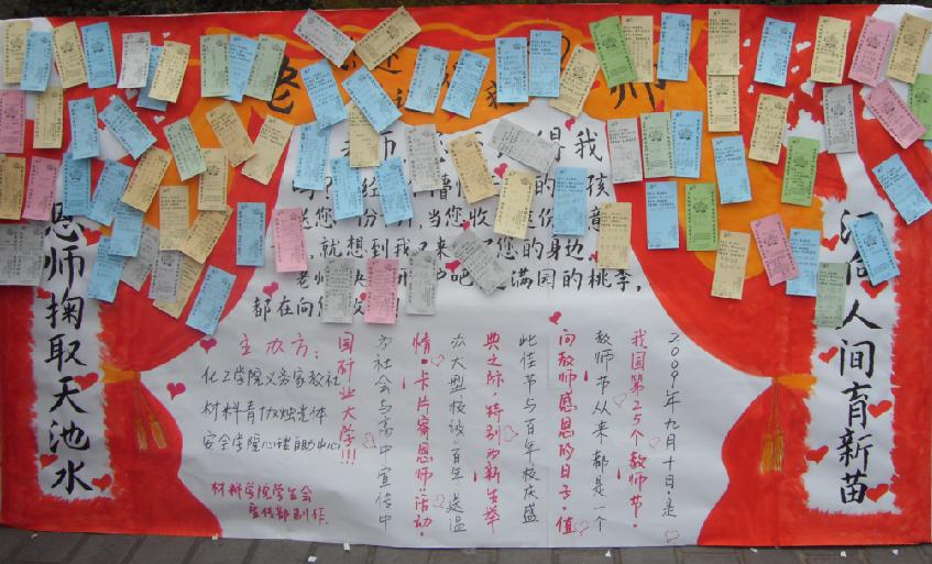 心理自助中心、化工学院义务家教社和材料学院青协烛光体一同制作的迎教师节展板,在一食堂展出。每个走过的学生都会在五彩的便签纸上写上自己对老师最诚挚的祝福。之后,他们又将这些漂亮的便签纸粘到展报上,让过往的教师读到同学们对他们的谢意和祝福,感受到学生们送出的满满的温暖。