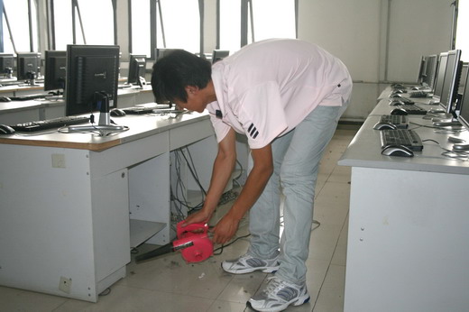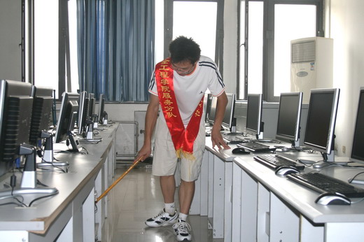 图书馆门口集合后,一同来到计算机学院四楼的机房。机房的工作人员向服务分队成员们提供了吹风机等清洁工具,并详细讲解了本次服务工作的内容。在工作人员向大家示范了清洁工具的使用和计算机的检查调试方法后,队员们便在各机房纷纷行动起来。活动过程中,队员们分工明确,有的负责有吹风机清除计算机主机及电源线间堆积依旧的灰尘,有的负责清扫,还有的负责计算机的检查和调试。经过两个小时的认真工作,服务分队的成员们顺利完成机房的调试清洁工作。