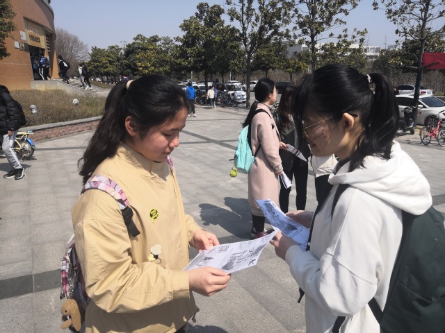 中午十二点,服务分队的干事和志愿者们在三食堂广场集合。在宣传工作开始之前,学生干事和志愿者们已经事先商讨了相关事项,并分工进行各项准备,以确保宣传活动顺利进行。十二点十分,宣传活动正式开始,志愿者们向过往的同学分发宣传海报,并细致地介绍本次活动的相关事宜,还为一些感兴趣的同学讲解了很多关于植树节的知识。志愿者们的热情介绍和漂亮的小盆栽吸引了越来越多同学的关注。十二点五十分,随着最后一张宣传海报的发出,本次宣传活动圆满结束。
