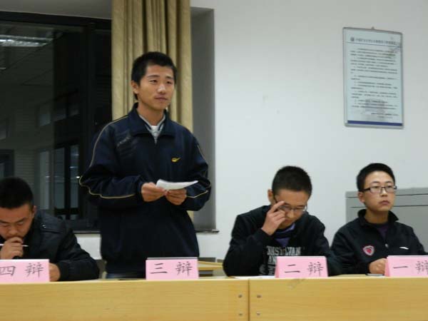 学术科技部主办的新生辩论赛在10月27日进入了冠亚军的争夺。安全13-2班和13-4班在之前的淘汰赛中杀出重围,会师决赛。安全12级曹蒙钰、孙勇、褚萍、王硕、黄伟担任此次比赛的评委。