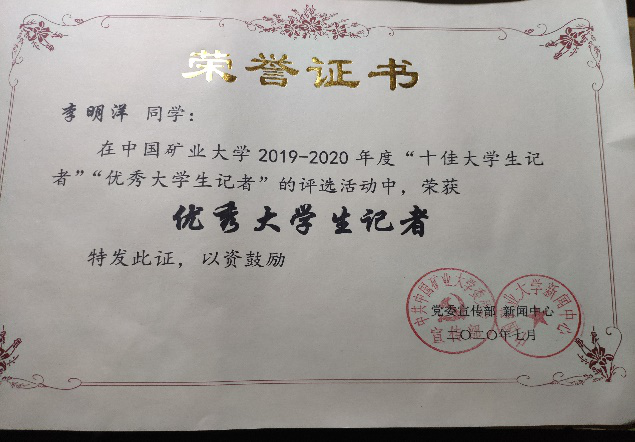 新闻传播中心编辑部部长,并获得了“优秀学生干部”荣誉。
