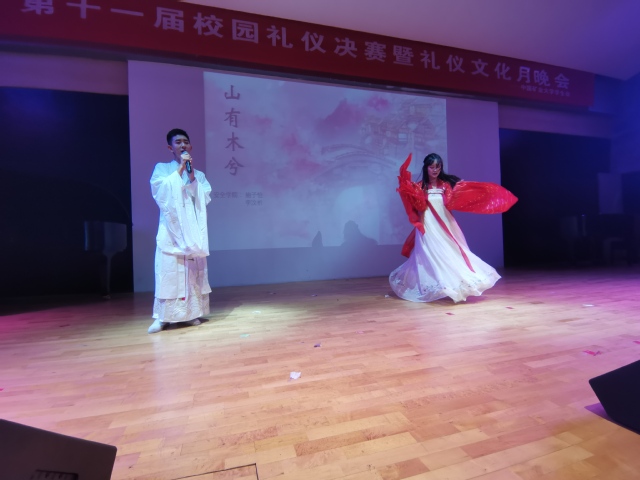 比赛开始前,校园十佳歌手鲁旭冉登台献唱,带动了现场的氛围。随后,比赛正式开始,参加决赛的各学院礼仪小姐和礼仪先生依次上台进行T台走秀,展现自己的礼仪素养。在风格不同的背景音乐衬托下,每一位礼仪小姐和礼仪先生都身着不同风格的礼服,迈着优雅的步伐,他们或展现自己的端庄大方,或展现自己的翩翩风度。其中,鲍子怡和李汶析身穿具有唐朝风格的古代礼服,展现中国传统文化中女子的端庄贤淑和君子的潇洒飘逸,体现了中国源远流长的礼仪文化。之后,各学院依次进行礼仪风采展示,鲍子怡跟随音乐翩翩起舞,李汶析则唱着歌走上舞台,两人共同带来一场歌舞表演。礼仪风采展示环节过后,评委巍子老师进行点评。她首先对参赛同学的礼仪风采表示肯定,并指出了他们存在的不足,最后她结合本次比赛向在场的同学们讲述了礼仪的重要性。