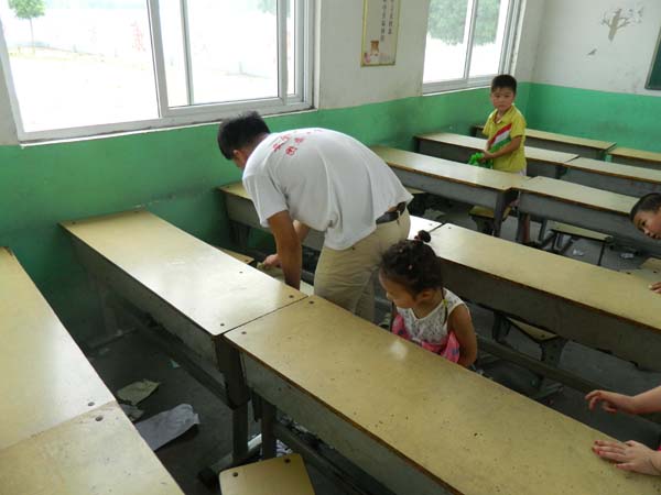 “爱心阳光之队”此次支教活动受到了当地全村人民的关注和支持,来参加支教的同学人数已远远超过了之前的预期。但狭小的教室容纳不了太多的同学,因此需要开放新的教室来辅助教学工作。此外,因为暑期放假已经接近1个月,教室内的卫生状况实在令人堪忧。面对如此状况,“爱心阳光之队”的志愿者们决定开放新的教室并进行打扫工作。前来参加支教的同学看到此情此景便主动要求参加到大扫除的队伍当中来。经过团队成员们的慎重考虑,志愿者们决定同同学们一起打扫教室。