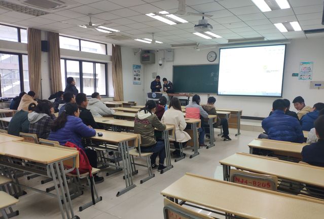 上午10时,班长袁满上台开始主持班会。他先向班级同学们详细讲述了何为优良学风班,如何建设优良学风班级,以及优良学风班的评比细则。袁满提到,选择建设优良学风班的目的在于提高班级整体的学习状态,希望大家在建设的过程中互帮互助,共同前进。随后,班长对班级前期开展的一系列工作活动进行了总结,并对上课状态、考试成绩、晚点名出席率等方面提出进一步的要求。随后,班长又给同学们陈列出班委们商讨出来的班规,并将文件发到群里,让同学们进行详尽认真地阅读。最后,为了不出现边缘化人群,让所有人都能参与到班级活动中,提高班级的凝聚力,班长设置了全班的值日制度。同学们在班长讲完后,纷纷提出了自己的疑问和建议,大家的主动性很高,开展了激烈讨论,为班上制度的完善都贡献自己的一份力。同时,班主任周红星也为同学们提供了宝贵的建议,向班上所有人讲述了大学四年该做什么、该怎么做计划、如何寻找自己的方向、如何坚定的实现自我目标等有助于同学们成长发展的经验。