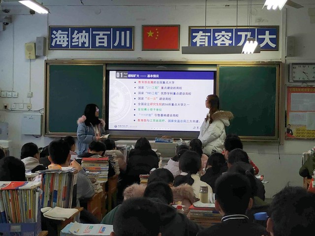 冯温婷与其他学院三名学生组成实践团,分别于1月18日和1月21日重回母校—长岭中学,拜访老师,交流大学心得,并进入高三班级进行母校行宣讲活动。