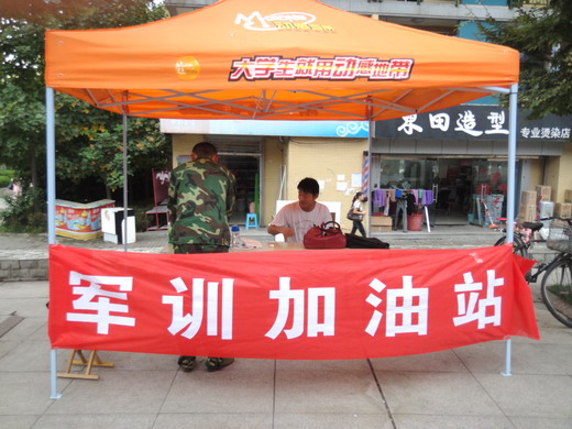 团委、学生会便在军训场地二食堂西搭起帐篷,为教官和新生提供休息场所。“军训加油站”中备有充足的饮用水以及创可贴等必要的医药用品以供教官和新生不时之需。团委、学生会早前排定了值班表,保证军训时间段尽最大可能做到有专门的各部门值班人员在场,为教官和新生提供各项服务。