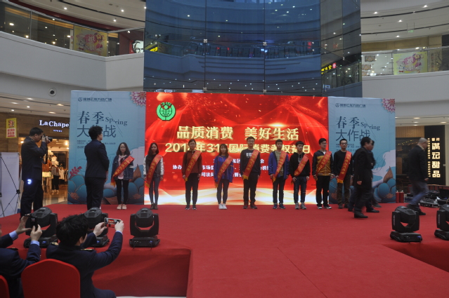 上午十点,宣讲会于云龙区万达广场正式启动。在开幕式上安全志愿者们依次上台,由协办方亲自授予绶带。在主办方的指导下,志愿者们在万达广场内积极向市民发放宣传单和消费者维权知识读本,并进行消费者权益的讲解,得到了市民的良好反馈。在向市民宣讲的同时,带领有疑问的市民前往咨询处。现场气氛热烈,不时有行人前来咨询有关消费者权益的问题,极大的提升了市民对消费者权利的认识。