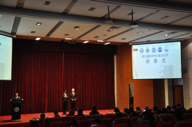 下午2:30,闭幕式正式开始。主持人进行开场致辞,对这一个多月各校进行的记者文化节活动做了一个简单的总结,随后宣布记者风采大赛决赛正式开始。决赛由来自各个高校的九组队伍出赛,分为“团队风采”、“推陈出新”、“新闻知识竞答”、“还原新闻现场”四个环节。整场比赛上,各参赛队伍紧张激烈的角逐着,利用自己的新闻知识和文学积累完美的诠释了作为一个“新闻人”的素养。比赛结束后,各高校的校媒主席对参赛队伍们的表现作出评价和指点,并为优秀参赛队伍颁奖。闭幕式的最后由第五届徐州市记者文化节负责人、包子漫画