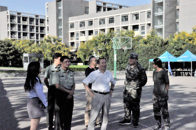 党委书记章毛平、党委副书记钱雄、行政副院长朱晓东在辅导员刘世通等人陪同下前往第三运动场视察2018级新生军训情况。