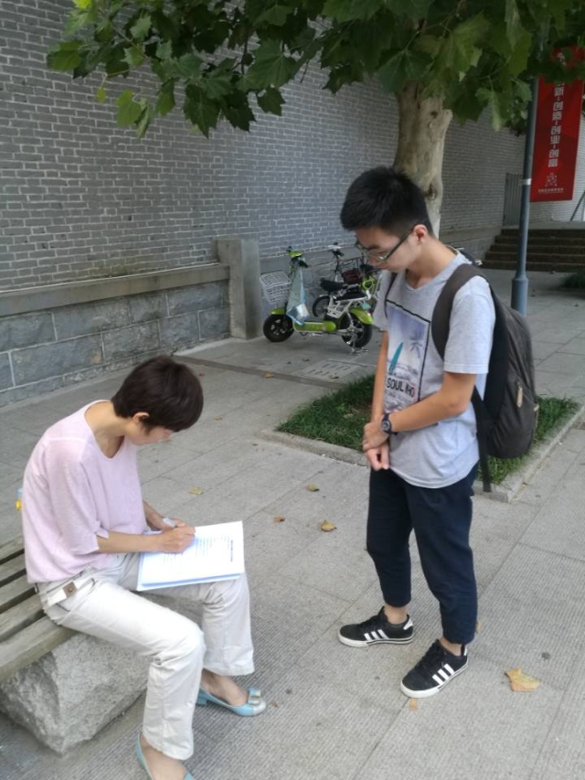 上午,队员首先来到曲阜师范大学进行采访。进入大学,又一次感受到了浓厚的学习氛围。在这座慢节奏的城市中,行人少了些许浮躁,多了对追求知识和精彩生活的思想。随处可见的儒家经典名言警句处处在提醒外来游客儒家的思想内核,传播着仁义礼智信,同时也时刻提醒着在这座城市生活上学的人们,要将儒家文化发扬光大,广泛传播。成员在这种环境中,拿起提前准备的问卷请路人填写。问卷内容涉及个人兴趣和未来儒家发展两方面。在得知我们的来意之后,大家都很支持我们的实践活动,并积极填写。随后成员进入教学楼,将问卷分给正在奋笔疾书的青年学子。他们或许答案不同,对儒家文化的看法不同,但是相同之处就是一颗乐于助人真诚待人的心。与预期情况不同,成员的问卷和采访未收到阻力。