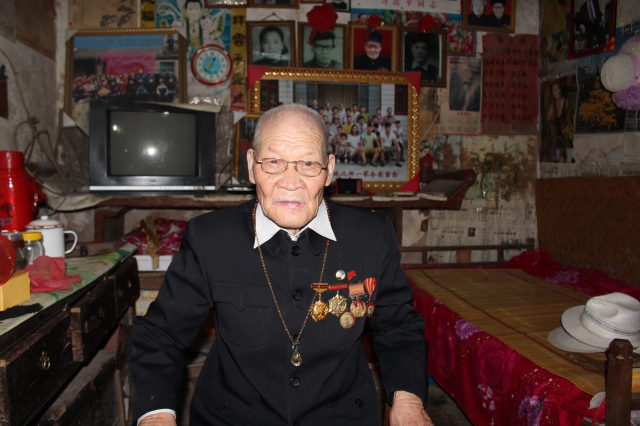 邱德奎老前辈有一个哥哥,兄弟俩都参军了。老前辈讲述了他的抗战故事:“打小日本的时候,还能想起来,是在东北,东北有个日本人成立的汉奸队,有日本,也有汉奸,他们混合。我们跟他们打进去,那个时候,日本人就完蛋了。我们在外面包围,他们前进的话,我们就堵住他们,之后,扔手榴弹把他们全部消灭了。手榴弹,我用过几次都打不通那个头,人的头很结实的,肉就不行。在解放战争的时候,打国民党的部队,1947年打反攻,我们去了一个团,去打江里的大部队。这个事,我们根据这个侦查员的话,走了180里路,速战速决,消灭这一个连,再休息,所以他们的部队也不知道我们有几个部队。”他还说:“中国的腐败不反就不行,胡锦涛的八荣八耻、现在习主席的反腐败的规定,我也都学会了。人活在社会上不能做亏良心的事,无贪不义财,不义之财我不贪。福从良善得,祸从奸巧来。要以理服人,不能打骂人。这样才管用,行善作恶自己知,你自己做什么坏事好事你自己知道。”