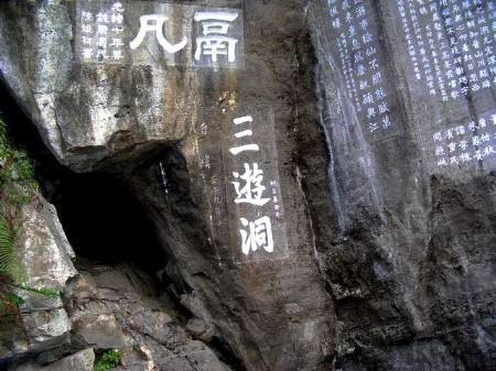 三游洞的名字源于两个典故,唐代诗人白居易、白行简、元稹三个人曾一同游过此洞,人称“前三游”;而到宋代,苏洵、苏轼、苏辙父子三人也一同来游过此洞,人称为“后三游”。上午九点,部分团队成员抵达三游洞景区。三游洞洞中横排3根钟乳石柱从天而降,将三游洞自然分隔为前后2个石室。 前室与后室之间这两根并列垂下的钟乳石,宛如门楹,浑然天成。三游洞的整个巨大洞体,由许许多多的钟乳石柱矗立其中,看起来就像是由钟乳石柱支撑起来的一样。历代途经夷陵的人,大都到此一游,并以楷、隶、行、草各种字体和诗歌、散文、壁画、题记等形式写景抒怀,镌刻于石壁之上。至今洞内外尚存有宋代欧阳修题记、明代重刻之《三游洞序》等各种壁刻和碑文40余件。