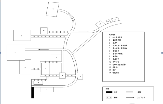 图幅的绘制经历了以下三个阶段:实地走访调研、交换意见讨论以及计算机录入三个过程。在走访调研期间,调研团成员实地走访旧址,详细记录有关旧址建筑的位置信息和旧址中的道路信息,从而为图幅的绘制工作打下了基础。走访旧址期间正值重庆高温时节,调研团成员不惧酷暑和崎岖山路,用顽强的毅力抵达旧址,在当地居民和附近职工的热心帮助下,队员们较顺利地采集到部分旧址的方位信息,并及时地记录下来。在讨论期间,调研团成员充分地交换了各自所收集的信息,并对各成员收集的信息展开了充分的讨论,最终确定了方案。由于调研场地的限制,在讨论之后,调研团决定先在调研地手绘草图,待调研结束时,由专人将手绘草图录入计算机,实现草图的规范化。由于现今在矿大旧址生活工作的居民均为矿大搬迁后迁至此地,关于建筑往日的用途也是口口相传的,个别建筑已无从考证,成为了调研团本次绘制工作的一大遗憾。希望将来随着调研工作的更深入开展,能够绘制出更加清晰完整的矿大旧址地图。