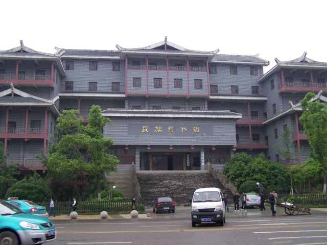 上午九点钟,成员们到达民族博物馆,民族博物馆坐落于黔江区新华大道西段158号。成员们在门口便可看见民族博物馆几个大字,接着成员们走进博物馆,映入眼帘的是一幅巨大的红色的木雕。它占据了博物馆大半壁墙,至少长8米,宽3米。木雕上刻着如黛的远峰,明澈的小河,河边的悬崖绝壁上,还有几幢树木掩映着的土家吊脚楼。博物馆内另一个展区,展示了土家族和苗族用来吃饭的火铺。这是土家族室内的一个重要陈设,也是一家人的活动中心。据说,做饭用餐、接待朋友、冬日取暖等日常活动,以前的土家人都在火铺上进行。黔江作为革命根据地时,贺龙带领的红三军入乡随俗,火铺也成了红军日常起居的重要组成部分。博物馆展出的这个火铺很特别,贺龙曾经就在上面吃过饭睡过觉。参观完毕,成员们找到工作人员,问了一些自己的疑惑,工作人员耐心的进行了解答。随后,成员们离开民族博物馆。