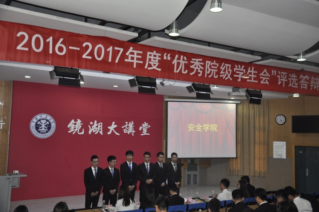 在传承安全优良传统活动中推陈出新,加强内部建设,外巩工作作风。最后,武文杰谈到了对未来的展望,要紧抓机遇。随后,面对主席团的提问,安全代表成员从容应答,顺利的完成提问。最终,经过半小时的统计评选出一系列院级优秀学生团委奖项。由主持人公布评比结果,各领导进行相应颁奖。最后,各学院主席团进行合影留念,主持人宣告此次答辩顺利完成,各学院有序离场。