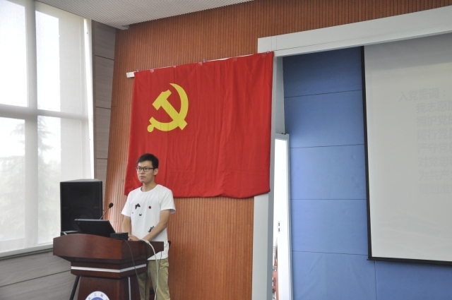 上午九点半,会议正式召开。会议第一项是举行新党员和老党员宣入党誓词活动。在入党宣誓仪式高亢的国际歌伴奏下,13级的崔捷领读誓词,全体党员起立面对党旗进行忠诚地入党宣誓,随后来自13级的张宏民和15级郑思文分别讲述了自己在党的领导下,如何在学习和生活中践行党的要求,并使得自己变得更加优秀的历程。