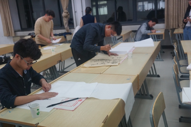 晚上7:00整,活动准时开始。不断有同学向B303教室送来自己精心创作的绘画作品和篆刻作品。来参加书法比赛的同学们在B304教室门口签到后进入B302、303、304教室进行现场软笔书法与硬笔书法的创作。参赛的同学们聚精会神、胸有成竹,有的挥毫泼墨,飘逸洒脱,有的一笔一画,力透纸背,有的气韵生动,入木三分。选手们采用的字体极为丰富,有刚正不阿的楷书、飘逸洒脱的行书、轻重有致的隶书还有古色古香的小篆等。一幅幅风格各异的作品都展现出了同学们对中华传统文化的向往与传承。现场的工作人员认真登记好参赛者们的个人信息和联系方式并将所有参赛作品分类整理好后将交由老师与书法协会投票,剩余作品的投票将在下周进行。