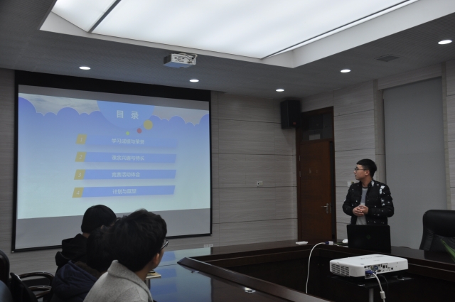 下午四点十分,会议准时开始。首先,“梦之队”的各个成员分别上台对自己过去一年半里的学习与生活进行了总结,同时对自己未来做出了规划。随后钱书记点评了成员的发言,并鼓励同学们掌握好时间,充分大学中真正有效的三年时光。针对同学们提出的关于“本科生如何在专业知识不足的情况下做好大学生创新项目”的疑问,程主任提出了指导意见。他首先指出不要把题目范围选定地过大,大学生要学会借助导师的力量,慢慢地学习一些基础知识和技能。其次以自身为例勉励同学们勤于思考,把英语学科放进脑子里重视起来。最后于老师对会议做出了总结,他肯定了同学们认真的态度同时希望同学们在学习上更上一层楼。