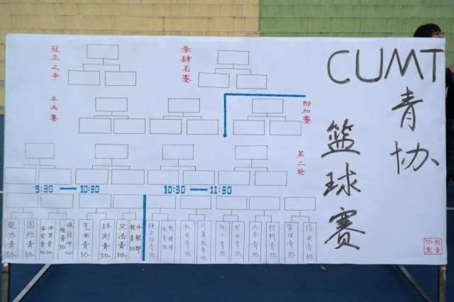 8点20分CUMT青协篮球赛开幕式正式开始。首先主持人致开场词,宣布2016CUMT青协篮球赛开幕式正式开始,之后分别介绍了到场的各学院青协篮球代表队。接下来校青协主席闫旭关于篮球赛将带来的积极成果发表讲话,他表示:为弘扬志愿精神,服务校青协宗旨,此次篮球赛将向徐州市福利院进行书籍捐赠。整个篮球赛期间,校青协干事将会对每场比赛的得分(取两队得分的平均数)进行加和,于最后一场比赛结束后得出总分数,然后以每5分一本书籍的方式进行物资捐赠,并于闭幕式上进行物品交接仪式。8点50分伴随着校青协干事篮球赛的结束本次开幕式落下帷幕。