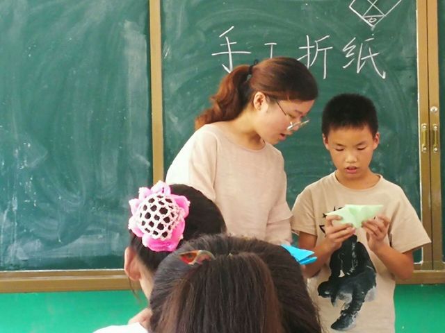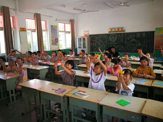 “仲夏希望”支教团在安徽省萧县陶楼小学各个年级开设了趣味手工折纸课,教给学生们多种多样的折纸。