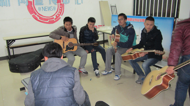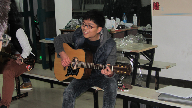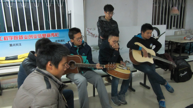 晚上九点整,指导老师徐毅斌带领同学们来到活动室,每位同学都背着一把吉他,看起来颇具有音乐狂热分子的气质。首先老师为每一位同学的吉他进行了校音并为同学们弹奏了一首轻快的小曲,使现场气氛随即变得愉悦起来,同学们也伴随着节奏哼出了小曲。随后,老师为同学们演示了几种弹奏的基本方法,如基本的指法,扫弦,勾弦等。同学们都兴趣盎然,听得专心致志。然后,老师为了让大家了解到吉他蕴含的音乐韵味,决定和同学们边唱边弹。老师拿出两本厚厚的吉他谱,挥手示意同学们上前选曲,来自安全一班的同学显得格外积极,全都围着吉他谱兴致勃勃地选曲。在弹唱过程中,每位同学的脸上都透露着快乐的表情,沉浸在音乐艺术中。随后,老师也介绍了几种比较流行的吉他款式,分别从吉他的选材,制作方式,音色效果,外表外观进行知识的普及,解决了刚开始学习吉他的新手的各种知识困惑。最后,团长褚天魏为整个课程做出了总结,并安排了下次课的时间和地点。