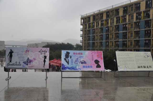 和其他学院的女生部纷纷为大家准备了精美的展板,展板上的文字和图片相互映衬,为大家详细地介绍了中国文化礼仪和中华传统服饰的由来。尽管由于天气的原因,礼仪小姐和礼仪先生不能为大家展示优雅端庄的服饰,但同学们的热情依旧不减。仍有许多人被精美的展板所吸引,积极参加到这次的活动中来。同时,现场也有许多的工作人员为前来的同学们解答和介绍中国悠久的文化礼仪。同时也有许多的同学慕名而来,站着展板进行拍照,足以见得同学的积极性和对中华文化礼仪的探索之情。