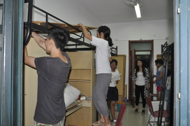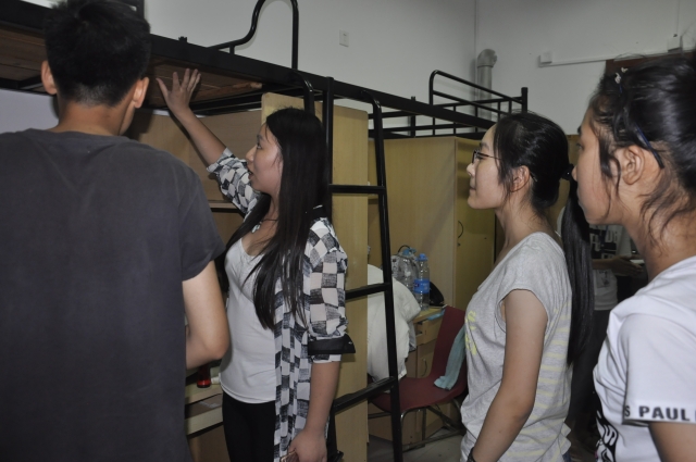 为了提高内务整理的效率,辅导员陶冰冰和郑文奇两位老师分别负责女生和男生宿舍。在女生宿舍,陶老师向新生详细介绍了内务整理的具体要求,包括宿舍门窗墙壁柜子的清洁、洗漱间的洁净、生活用具等的摆放方式等等。随后陶老师就昨天宿舍长会议中所布置的宿舍内务整理任务进行卫生检查,并且针对窗槽、阳台、墙面等卫生死角进行进一步强调。与此同时郑老师提醒男生在保证宿舍内务质量的同时还要提高速度,要不畏艰难,迎难而上,发挥自己的聪明才智将内务整理做到最好,争取在内务评比中为学院争光。