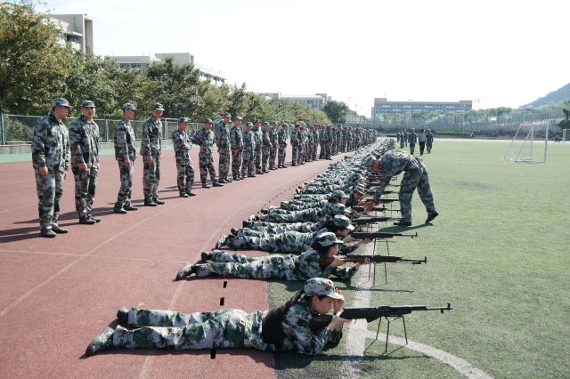 16级的新生身着整齐划一的迷彩服,排着队伍由第三运动场的训练场来到了第二运动场的射击训练处。首先,负责射击技能教学的教官为同学们详细讲解了步枪的组成、射击的原理、基本动作要领和其他的注意事项。同学们在仔细地听完讲解之后,被分成了几个小组,有序地参加射击训练,瞄准靶心、屏住呼吸、扣动扳机。每一次握枪、匍匐、抠动扳机时的他们认真的眼神和矫健的身姿,在第二运动场形成了一道风景线。那一气呵成、冷静稳健的动作赢得了教官和孙留涛老师的阵阵赞许。射击训练完成后,同学们对靶场的枪恋恋不舍,大多数同学更是纷纷报名参加射击比赛队员的选拔。曾经练过射击的同学还表示一定能通过教官的筛选,在接下来的射击比赛中为学院争光。