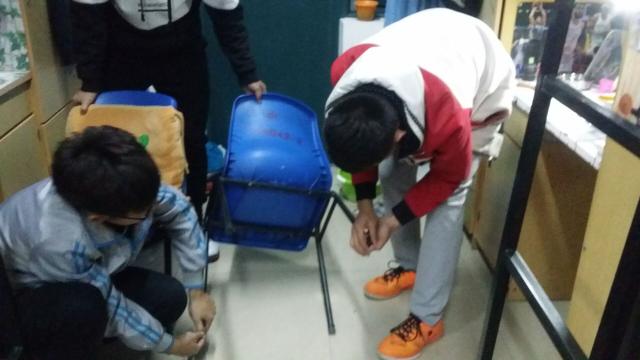 晚上7点30分左右,15-3班班长、组织委员和部分同学首先清点了座椅脚套,然后去各个寝室进行安装。座椅脚套分为圆、方两种,于是他们分为两拨人,分别去安装不同的脚套。15-3班同学进入每个宿舍后,他们会首先查看座椅的种类,然后拿出相对应的脚套。在安装的时候,将座椅倒放在地面上,先是用四个脚套轻轻的卡在座椅上,然后再把座椅正放过来,用双手用力去压两端,使其牢牢的固定在座椅上,这样便算完成了一套座椅的安装。15-3班的同学走进一个个寝室,拿出一个个脚套,安装一个个座椅。直至晚上8点40分左右活动才结束。