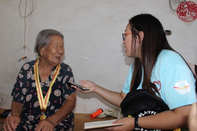 上午九时许,志愿者们到达甄兆兰老前辈的家中。甄老前辈今年已有90岁高龄,但仍身体硬朗,能较好的同志愿者交谈。老前辈告诉志愿者她小的时候娘家人比较多,都去要饭很穷,她选择去做地下工作,帮助八路军打游击战。她说:“当时我们就给人家看孩子、做鞋、做袜子,那时候我们这还有日本鬼子呢,都做地下工作,都晚上送去,白天不敢,日本人杀的人都没有数。那时候也没有吃的,都是糠咽菜。”后来老前辈回到家,于1949年结婚。采访结束,老前辈与志愿者亲切合影。