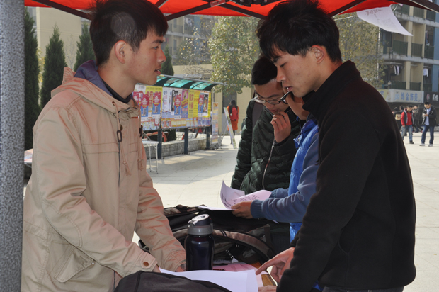 负责人员准备就绪,海报、横幅以及宣传单准备齐全,所有的工作人员有条不紊地进行着各自的工作。工作人员共分为三组,第一组进行宣传单的发放工作,宣传单内容简洁清晰,包含了报名时间、活动时间、报名方式等。第二组负责解决前来咨询的同学们的疑惑之处。其间,许多同学表现出对“一站到底”活动充满着浓重的兴趣,积极了解“一站到底”大赛相关的信息,工作人员对同学的疑问进行了耐心而细致的解答。工作人员谈到:此次“一站到底”大赛涵盖的内容齐全,从人文地理、时事娱乐到音乐电影、诗词歌赋应有尽有。第三组向同学介绍了活动的评选规则、活动的奖励形式等。