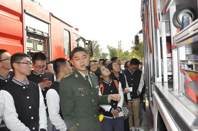 党委副书记钱雄,消防工程研究生所长朱国庆教授与学生一同前往消防队进行参观。
