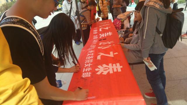 女生部联合矿业学院、环测学院、力建学院、电力学院、理学院、外文学院女生部于二食堂广场开展了“礼仪活动月系列活动之万人签名会”。