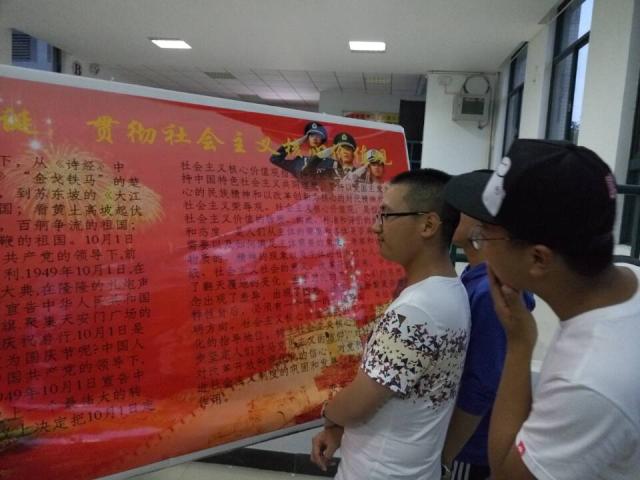 本次庆国庆展板活动于29日下午一点开始,在知行社成员们如火如荼,紧锣密鼓地组织和实践下,当天晚上八点,庆国庆展板在梅苑三号楼一楼大厅展出。展板以鲜艳的红色革命图为背景,其内容主要分为两部分,左半部分引用古文歌颂祖国大好河山,并介绍了将十月一日作为国庆节的整个来龙去脉,右半部分则介绍了社会主义核心价值观的主要内容以及贯彻社会主义核心价值观的意义。整个展板内容充实简短,文字清新有力,引来多位路过同学的驻足参观,特别是拎着大包小包准备回家享受假期生活的同学,在梅苑三号楼大厅门口形成了一道独特靓丽的风景线。