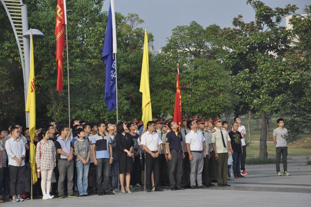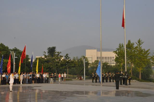 7:00,随着雄壮豪迈的《歌唱祖国》旋律声响起,护卫队护举着国旗健步走入升旗区,接着国歌奏响,全体师生庄严肃穆,五星红旗,在朝阳的映衬之下,迎风飘扬,冉冉升起。